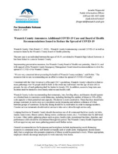 The Wasatch County Health Department announces an additional case as well as a resolution by the Wasatch County Board of Health to mitigate the spread of COVID-19. Visit coronavirus.wasatch.utah.gov for more details.