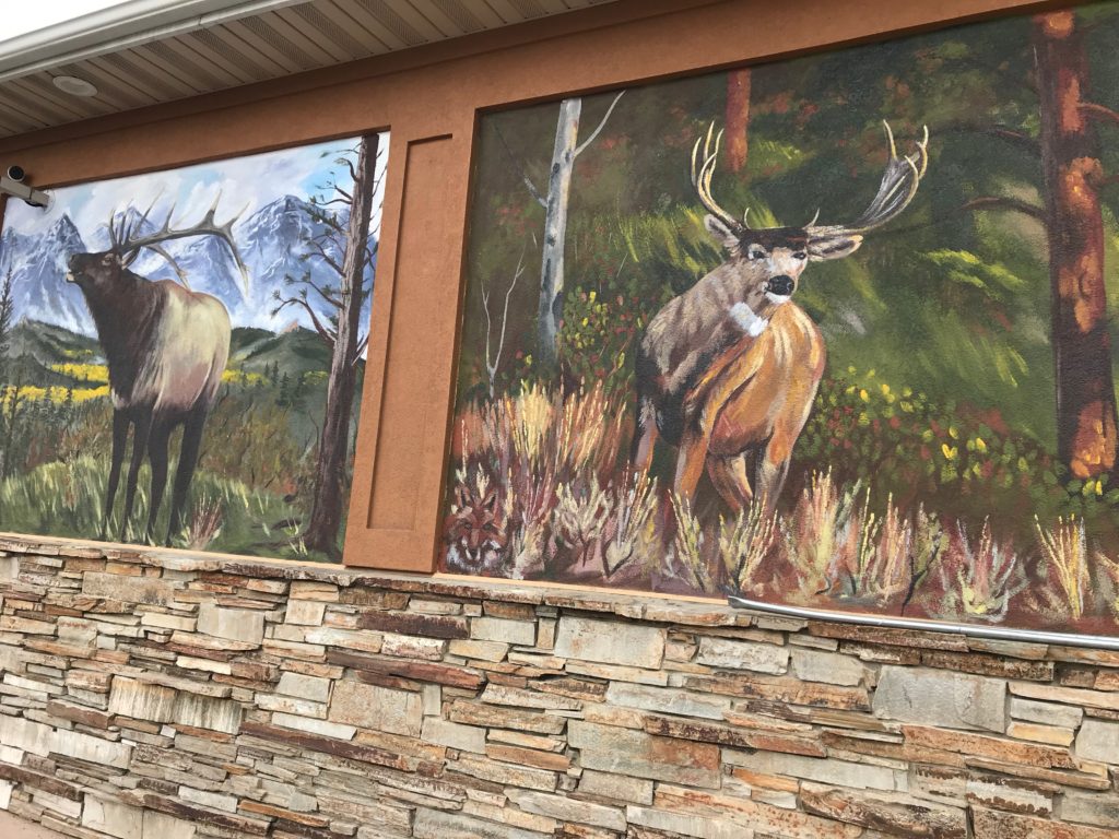 This week Fernandez is wrapping up the wildlife murals on the north side of the building with beautiful elk, moose and deer images. The murals were commissioned by owner Mohamed Mohamed, owner of the Sinclair Gas Station and have really given the corner of highway 189 and highway 40 something of beauty for passerby traffic and locals.