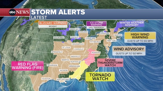 (NEW YORK) — A cross-country storm continued on Monday to produce heavy snow and strong winds in the upper Midwest and Great Lakes region, including an ice storm in northern Michigan, prompting thousands of flight cancellations and delays.